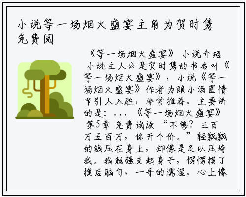 小说主人公是贺时隽的书名叫《等一场烟火盛宴》,小说《等一场烟火盛宴》作者为酿小汤圆情节引人入胜,非常推荐。主要讲的是:...