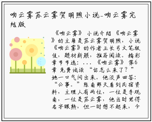 《吻云雾》的主角是苏云雾贺明煦,小说《吻云雾》的作者玉长弓文笔极佳,题材新颖,推荐阅读。精彩章节节选:...